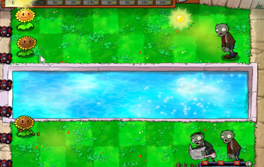 3-4关是一场在后院泳池进行的战斗,这关的场地分为水面和陆地两部分,开局不久后便会涌现大量墓碑,它们不仅会直接占据宝贵的格子阻碍你种植植物,更有概率直接从墓碑中钻出僵尸,对前期脆弱的防线构成严重威胁。针对这一关卡的特性,你的植物选择需要兼顾攻防与功能。向日葵作为核心经济来源必不可少,而攻击植物方面,寒冰射手和双发射手是可靠的火力组合,寒冰射手的减速能有效拖延僵尸推进,为后方输出争取时间。防御层面,坚果墙是抵挡僵尸的关键肉盾。你必须携带至少一颗樱桃炸弹,用以在紧急时刻清理成群的僵尸。功能性植物方面,荷叶用于在水面搭建平台,而窝瓜和大嘴花则是处理单个高威胁目标或弥补火力空档的优质选择,大嘴花尤其擅长解决那些会爆炸的僵尸。