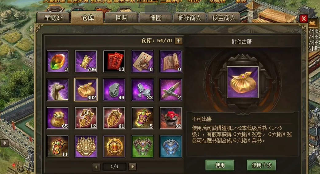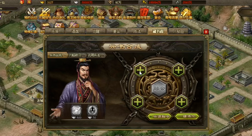 合成高级兵书是战国策残卷的主要应用之一,玩家需要在六韬合成界面将特定材料组合。合成一本9级兵书需要1本8级兵书、3本5级兵书、400本4级兵书和5本六韬残卷,过程简单,只需拖拽材料到界面并确认即可。