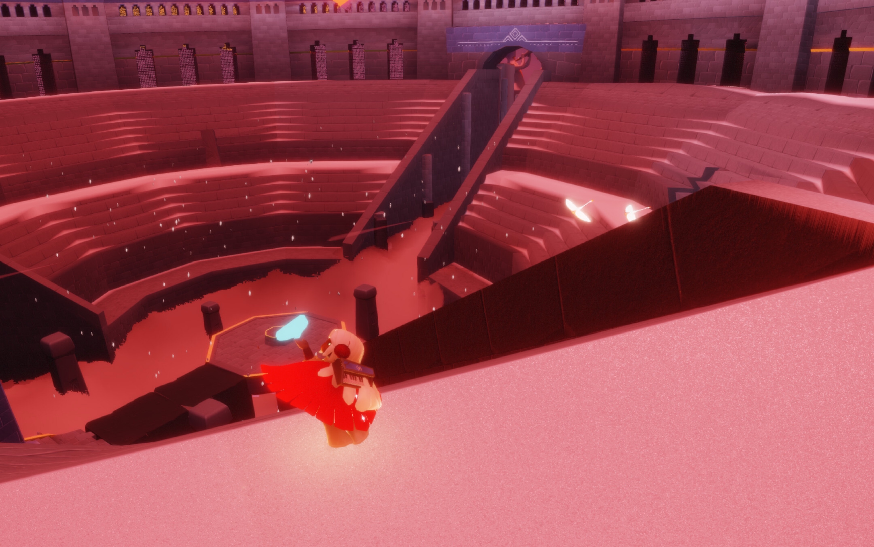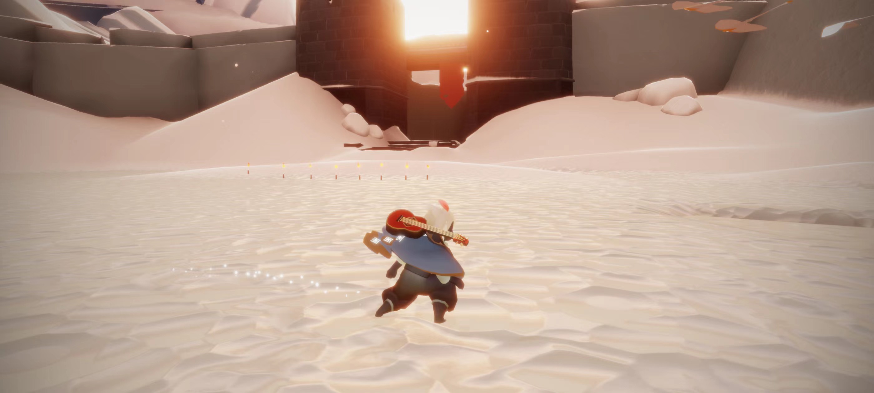 折返三塔中央最高白色石塔,沿塔身阶梯稳步向上攀爬,避开高空乱流落脚顶端观景平台,视野开阔极易定位,第三位招手先祖静静伫立平台边缘,无门槛直接触发追忆流程,跟随散落光点重温过往轨迹即可收集,招手动作常用于远距离组队集合、好友互动示意,实用性拉满,同时解锁高阶斗篷边角装饰兑换权限,提升穿搭层次感。
