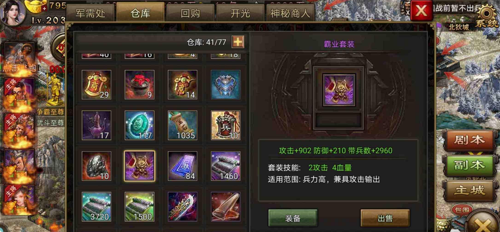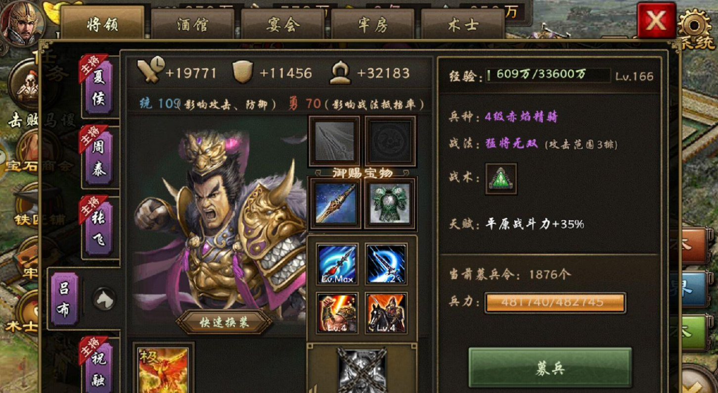 兵器配置方面需要优先提升攻击属性,左侧兵器全部强化至100级解锁真兵器属性,大幅提升整体攻防与带兵数量,右侧兵器依次强化至87级、55级、56级即可,资源分配上优先堆叠攻击,防御属性可适当放宽标准,保证输出能力足以快速压制敌方部队,避免被持续消耗导致战力不足。宝石搭配以攻击、血量为主,进一步强化前排承伤与后排输出能力,让武将在对抗过程中更具优势。