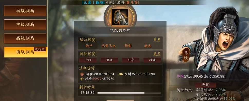 驯马官选择直接影响驯马效率与品质,需优先委任带专属驯马战法的武将,刘表的争分夺秒可减少10%驯马时间,马铁的按图索骥提升4%高品质马匹概率,张鲁的养马有道降低4%资源消耗,三者各有侧重,追求效率选刘表,追求品质选马铁,资源紧张选张鲁。无专属战法的高魅力武将如小乔,凭借高魅力成长能显著提升橙色马匹产出概率,可作为备选驯马官。驯马官的政治属性影响驯养耗时与资源消耗,魅力属性决定高阶马匹获取几率,委任前优先提升对应属性,搭配驯马相关战法与特技,最大化驯马收益。