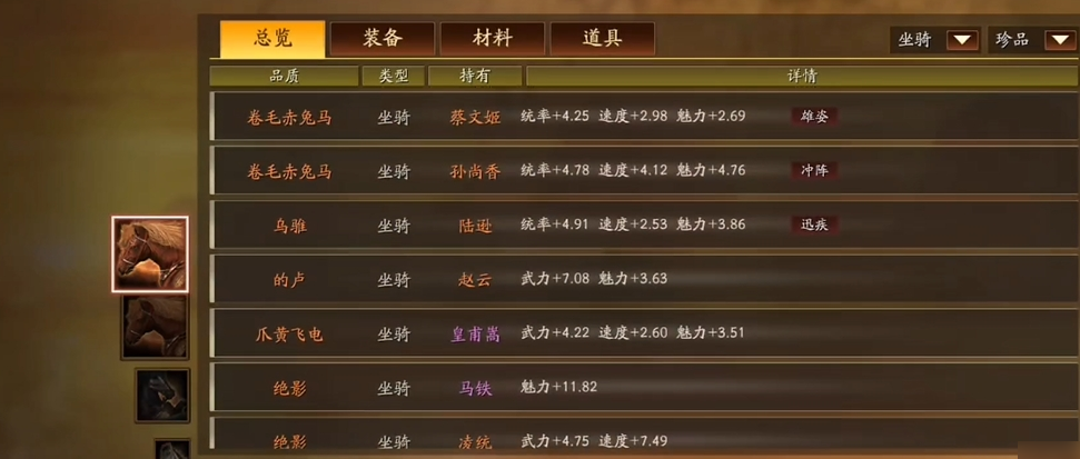 获取马匹后需进行深度培养,同名马匹可晋升,最多升至5阶,大幅提升属性词条数值;驯马草料可强化马匹,提升初始词条效果,强化至10级、20级可解锁马匹禀赋效果,获得额外属性或特技加成。马匹品质分为白、绿、蓝、紫、橙,橙马附带专属特技,如赤兔的疾驰、的卢的统御,能为武将提供关键战斗增益。培养时优先锁定橙马与优质紫马,集中资源晋升与强化,避免分散培养,根据武将定位选择马匹,骑兵武将优先选速度与输出型战马,盾兵武将优先选防御与统率型战马,让马匹属性与武将战法完美契合。