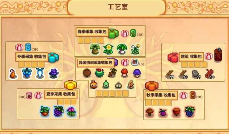 献祭任务分为六个房间的收集包,解锁顺序为工艺室、茶水间、鱼缸、锅炉房、布告栏和金库。工艺室需要完成春夏秋冬四季的觅食包,建议优先完成春季觅食包获取春季种子奖励。茶水间主要收集农作物,春季防风草、夏季甜瓜、秋季南瓜是核心作物,需提前规划种植时间并施用高级肥料确保金星品质。鱼缸收集依赖钓鱼技术,每个季度需预留几天在特定天气条件下垂钓,蟹笼包可通过击杀岩石蟹或海滩拾取贝类完成。