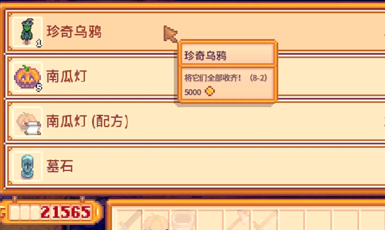除了普通稻草人,游戏中还有珍奇乌鸦(特殊造型的稻草人),它们的功能和普通稻草人一样,但外观更独特。珍奇乌鸦可以在冬季的旅行货车(猪车)处购买,价格是4000G。如果收集齐8个珍奇乌鸦,据说会有额外效果,比如保护范围翻倍,不过这一点需要亲自验证。珍奇乌鸦主要作为收藏品,喜欢收集的小伙伴可以留意。