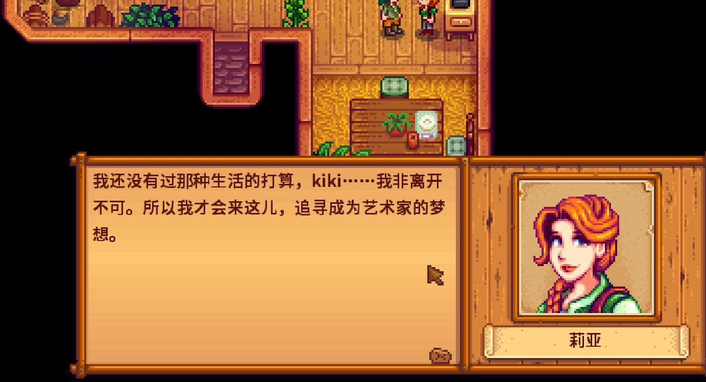 结婚后莉亚会搬到农场居住,农舍会增加工作室区域。她会帮助完成浇水、喂养动物等日常任务,偶尔赠送随机植物或食物。当婚姻好感达到13心时,莉亚会赠送星落表达爱意。她仍保留艺术创作习惯,有时会去森林或镇上寻找灵感,但晚上必定回家。玩家可以继续通过对话和礼物维持婚姻关系。