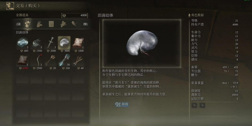 泪滴幼体是洗点的关键道具,通常每个周目只能获取有限数量,建议提前规划好使用时机。获取途径包括击败特定敌人或探索隐藏区域,比如宁姆格福的雾林废墟或利耶尼亚的湖泊地带。如果暂时没有泪滴幼体,可以先继续探索,顺便积累卢恩为后续加点做准备。