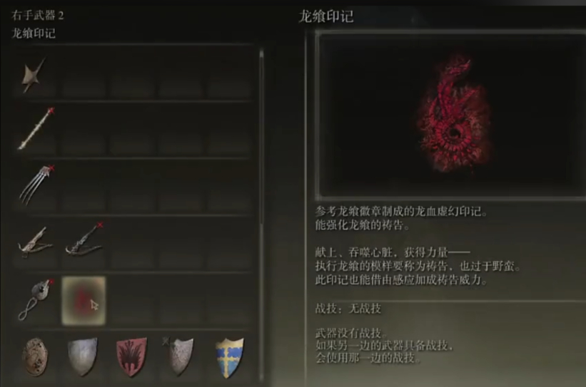 武器选择上,双持剥尸曲剑或山贼弯刀等攻速快的武器是主流方案,神秘质变可大幅提升面板伤害并兼顾出血积累。战灰推荐切腹,配合双持跳劈的四段攻击能快速触发出血效果。护符方面,龙徽大盾护符可增强生存能力,亚历山大的碎片则能强化战技输出。防具以高韧性与减伤为主,确保近战时的稳定性。龙飨印记作为核心触媒,需优先强化至+10以发挥其S级感应补正的优势。