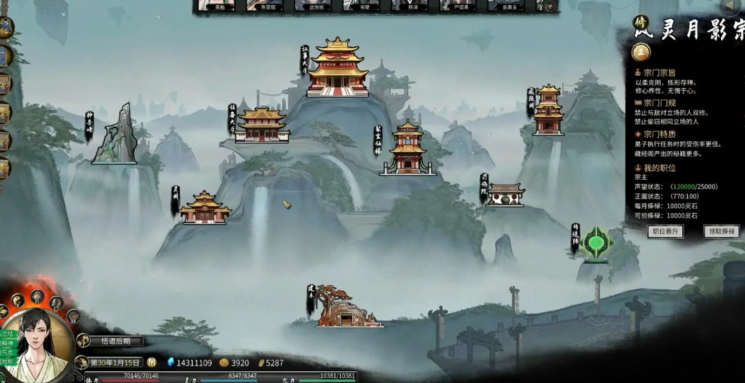 若选择通过常规晋升途径成为宗主,则需要满足一系列明确的前置条件并完成特定流程。玩家必须谨慎选择加入的宗门,务必确保目标是一个独立的宗门而非其他大宗门的分舵,通常独立宗门的名称相对简短且没有分舵的表述。加入宗门后,核心任务是长期且大量地积累宗门贡献与个人声望,这主要通过持续完成宗门任务、击败敌人以及探索地图来实现。当累计宗门贡献达到约24万以上,同时个人声望达到约12万以上时,便满足了触发传承事件的资格,游戏会提示玩家返回宗门接受挑战。最后的考验是击败宗门传承之灵,成功后方可正式继任宗主之位。